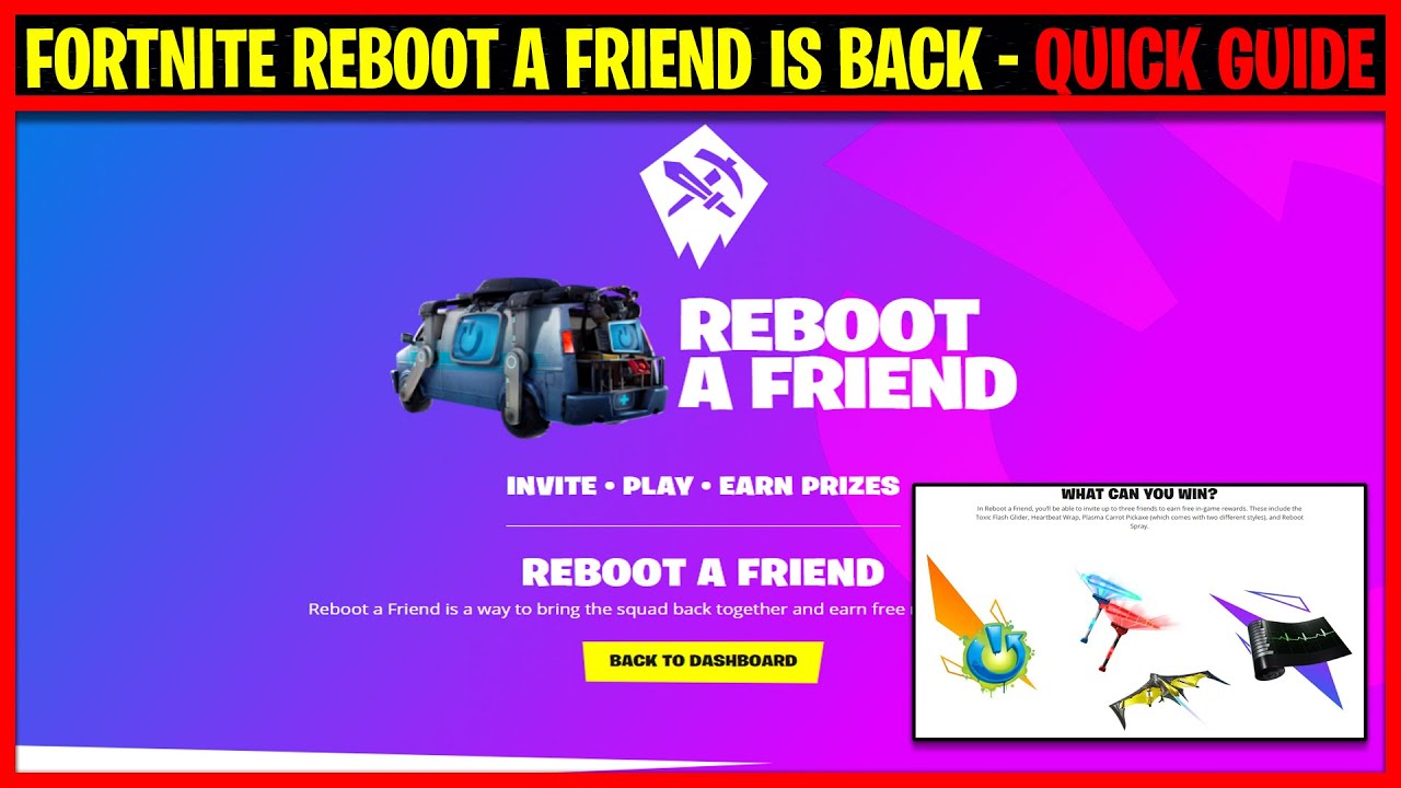 How to earn reboot a friend points together? Nov 19, 2020 · fortnite reboot a friend test begins. Apr 07, 2021 · fortnite 'reboot a friend' is back with free rewards the most celebrated event, 'reboot a friend' in fortnite, is once again back in the game. 'reboot a friend' is active only up to 26th april 2021. After this date, you will not be able to win rewards. Jun 04, 2021 · how to reboot a friend in fortnite 1. When does reboot a friend come out for pc? Fortnite reboot a friend event returns for those who don't know, the fortnite reboot a friend event is when players can help bring back some friends to the battle royale game to see what they have been missing out on. More images for friends reboot fortnite » During this test, players in participating regions may register on the website and invite eligible friends in order to participate. What does reboot a friend event do in fortnite? Play games with those friends to earn points and receive prizes. To be eligible for rewards, invitees must play one match with a successfully rebooted friend.